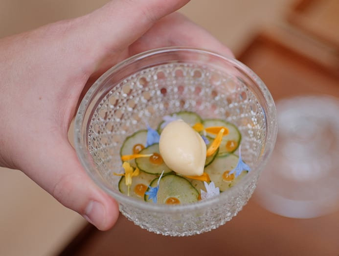 Chef Julien Royer presents a heartfelt tribute to springtime – scallops with beans and mussels, delicately infused with meadowsweet. Photo: Odette