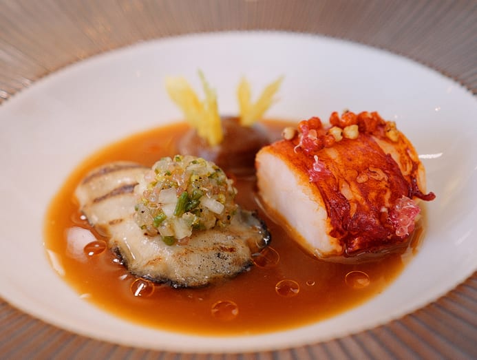At two-Michelin-star Chef’s Table at Lebua, contemporary French cuisine takes centre stage. Here, executive chef Vincent Thierry crafts an exclusive dish featuring Brittany lobster and plump grilled oysters, their oceanic brininess heightened by the delicate acidity of green apple aged for 100 days.