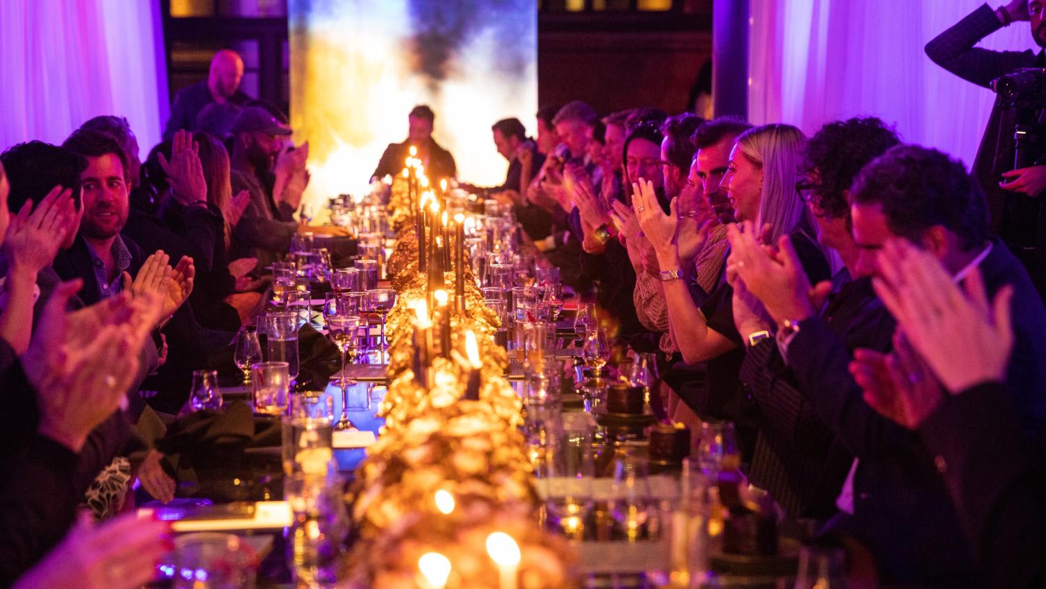 Forty guests made up of Diageo private clients, media, designers, gallerists and curators were invited to the transformed space. After viewing artwork customised for the evening and enjoying cocktails of Mortlach signature serves and Mortlach 30, the VIPs were escorted into the museum’s dining destination, Veronika, where dramatic full drapes provided the brand’s colourway of gold and indigo. Before the meal, creation studio Diorama unleashed a lush animation showing a drop of Mortlach making its way through six stills in six chapters – the ripe golden whisky adopting its unabashed beastly character through an exacting process.