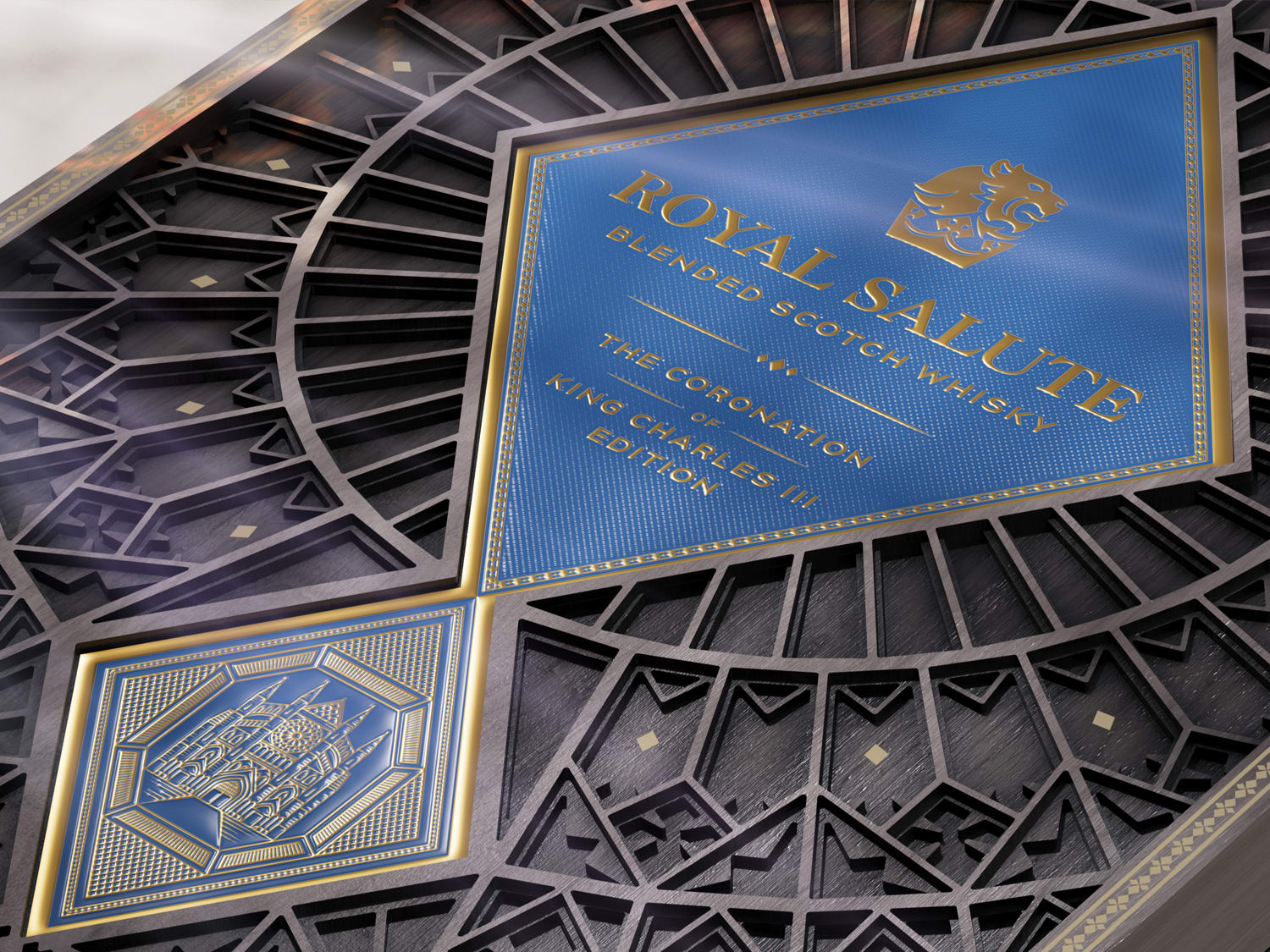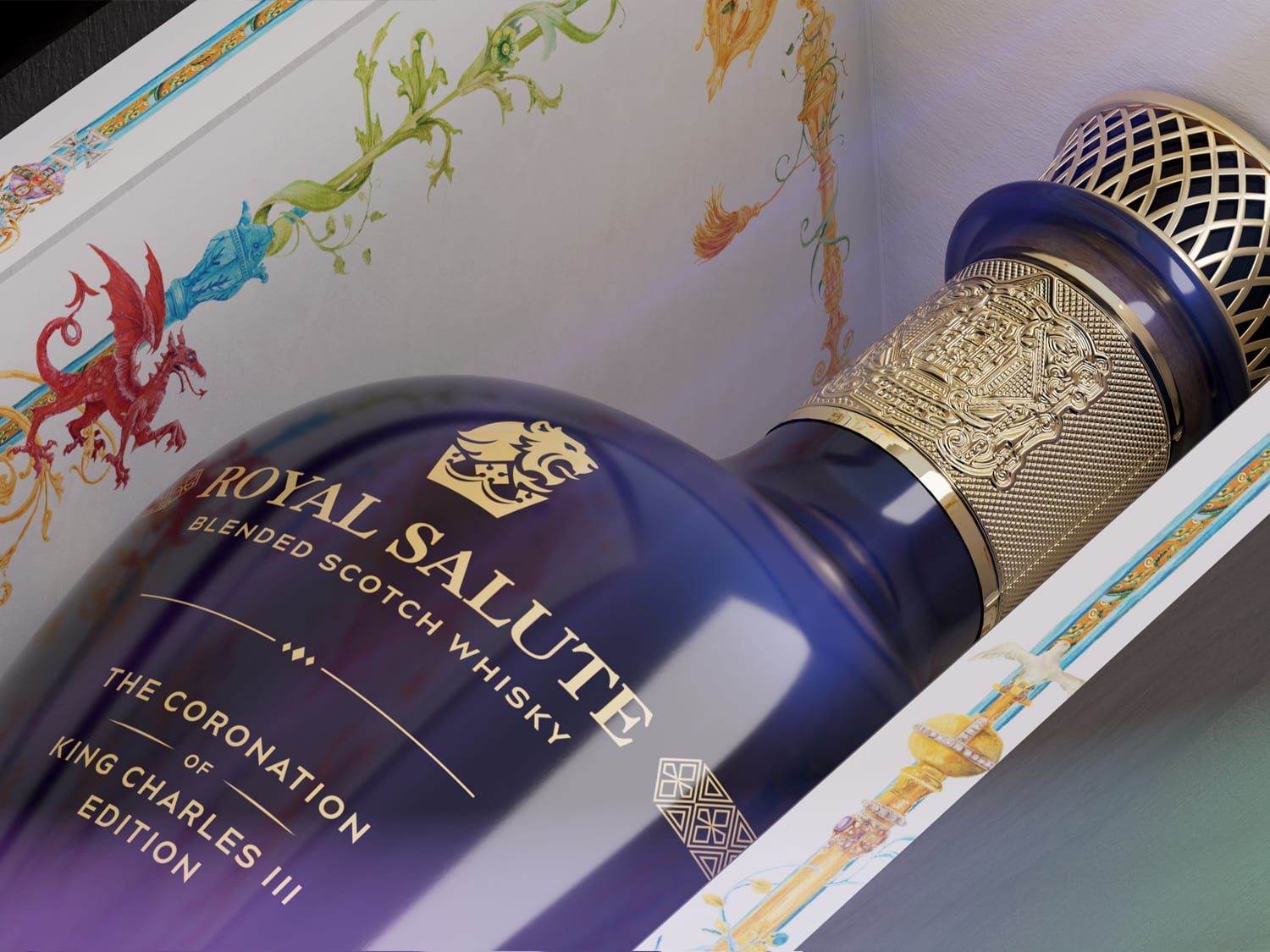 The Royal Salute Coronation of King Charles III Edition details a story of heritage with elaborate storytelling in its design, from bottle to box.