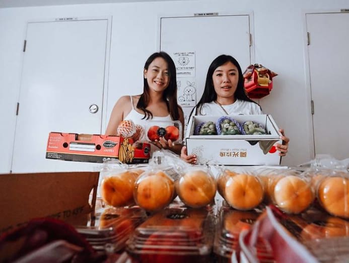 Group buy hosts Ashley Teo (left) and Cheryl Guo preparing orders for fresh fruits for collection. (Photo: Hanidah Amin)