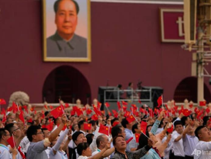 People wave Chinese flags during a ceremony to mark the 100th anniversary of the founding of the ruling Chinese Communist Party at Tiananmen Gate in Beijing Thursday (Jul 1). (AP Photo/Ng Han Guan)