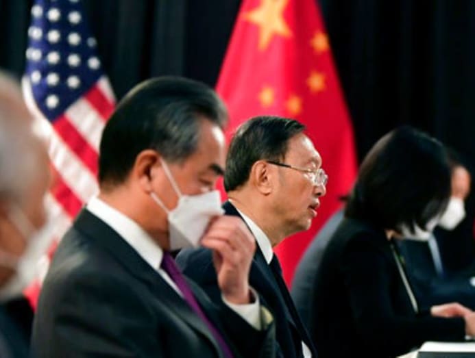 Chinese Communist Party foreign affairs chief Yang Jiechi and China's State Councilor Wang Yi speak at the opening session of US-China talks at the Captain Cook Hotel in Anchorage, Alaska on Thursday, Mar 18, 2021. (Photo: AP/Frederic J Brown)