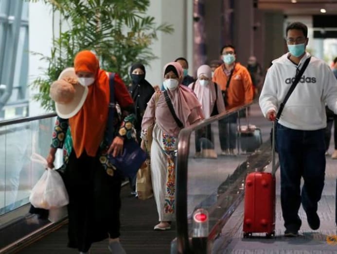 Passengers wearing face masks walk as they arrive at international terminal of Soekarno-Hatta Airport near Jakarta on Mar 13, 2020. (Photo: REUTERS/Willy Kurniawan)