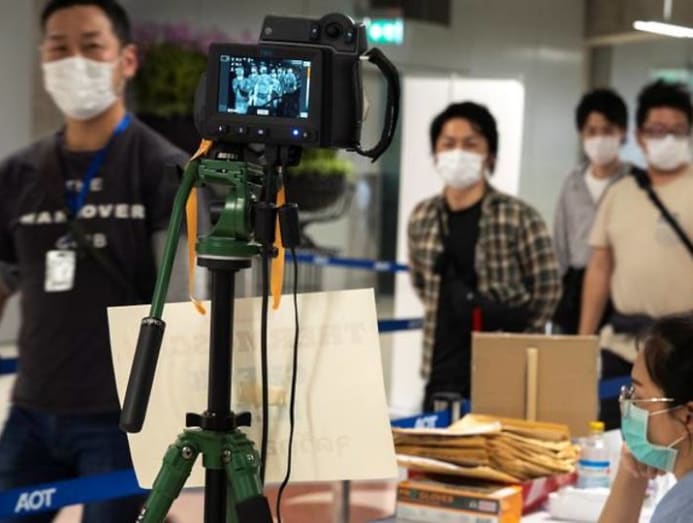 A thermographic device displays the temperature of arriving passengers before they enter immigrations at Bangkok's Suvarnabhumi International Airport, Thailand March 14, 2020. REUTERS/Athit Perawongmetha