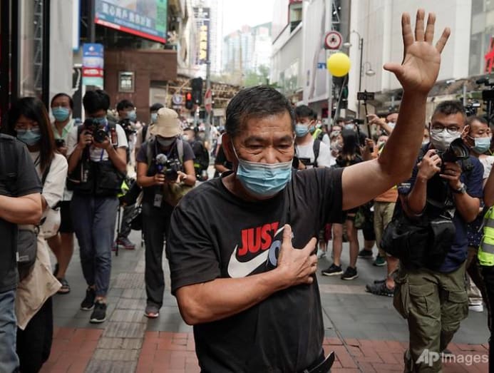 Protesters raise five fingers, signifying "Five demands and not one less" as they march in Causeway Bay, Hong Kong, Oct 1, 2020. (Photo: AP/Kin Cheung) Hong Kong China National Day