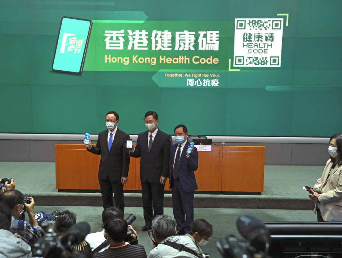 News conference in Hong Kong, Thursday, Dec. 2, 2021. The mobile app would allow travelers to cross the border to Guangdong province of Mainland China and Macao without quarantine. (AP Photo/Kin Cheung)