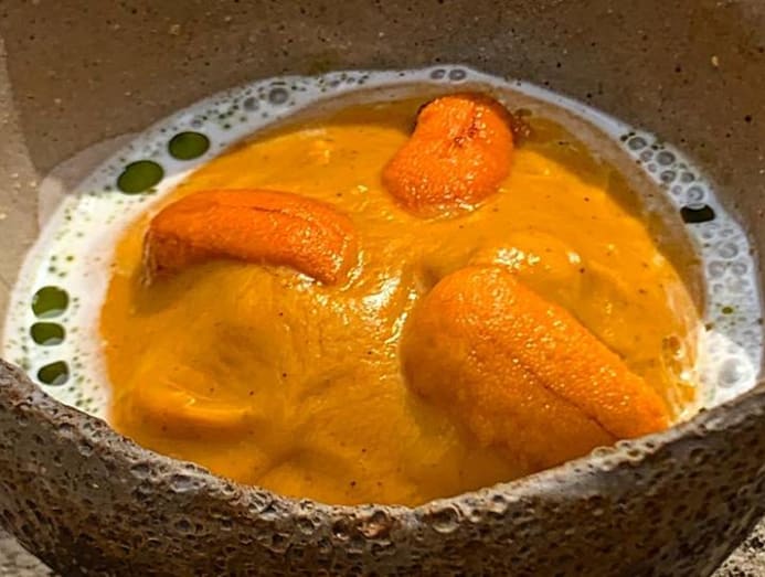 A razor clam dumpling in a piquant sauce was quickly adapted into the starfruit and mango ceviche, and a pumpkin curry with uni and a broth of prawn and belachan was modified into the smoked pumpkin curry with coconut emulsion.