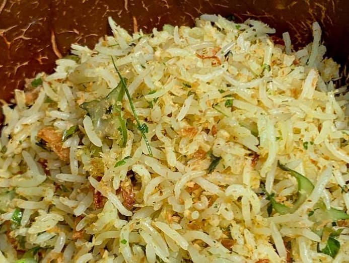 None of the dishes have easy journeys into their tiffins. To make the curry, for instance, Shen first cooks the pumpkin over charcoal, then extracts the pulp and smokes it using the recycled dried stems of herbs used in other dishes, like mint leaves, laksa leaves and curry leaves. After blending the pumpkin, he adds chunks of Japanese turnip that have been cooked butter chicken-style – marinated for three days in yoghurt and spices, to neutralise the naturally bitter taste and give it a hearty bite.