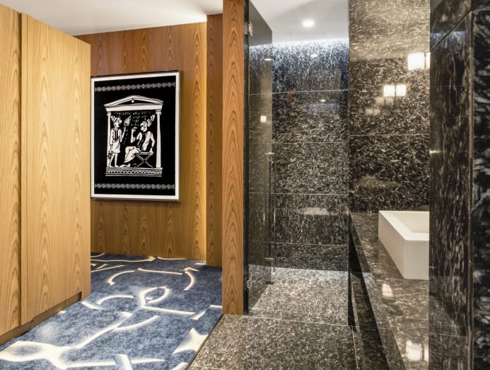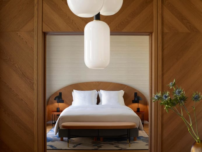 Guestrooms mirror the building’s elegance, with a cream-and-chocolate palette, wooden floors and Dionysus marble bathrooms. Custom curved bedheads and dark blue, bulbous Tom Dixon light pendants evoke the port city’s nautical history. In the restaurant, a fishnet sculpture by Greek artist Dimitris Fortsas emphasises the Mediterranean cuisine’s seafood focus. Top the stay with a culinary river tour that comes with a meal on board the Milos at Sea yacht.