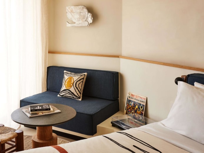 Located in Glyfada just half hour drive from the city centre, the hotel nestles among marinas, seaside restaurants and beautiful beaches framed by lemon-pink sunsets. The 120-key building on the Athenian Rivera was designed by French architecture and interior design firm cigue. White walls, straw furniture, timber elements, and coral and indigo tones meld a modern 1970s coastal vibe with the Greek naturalist style.