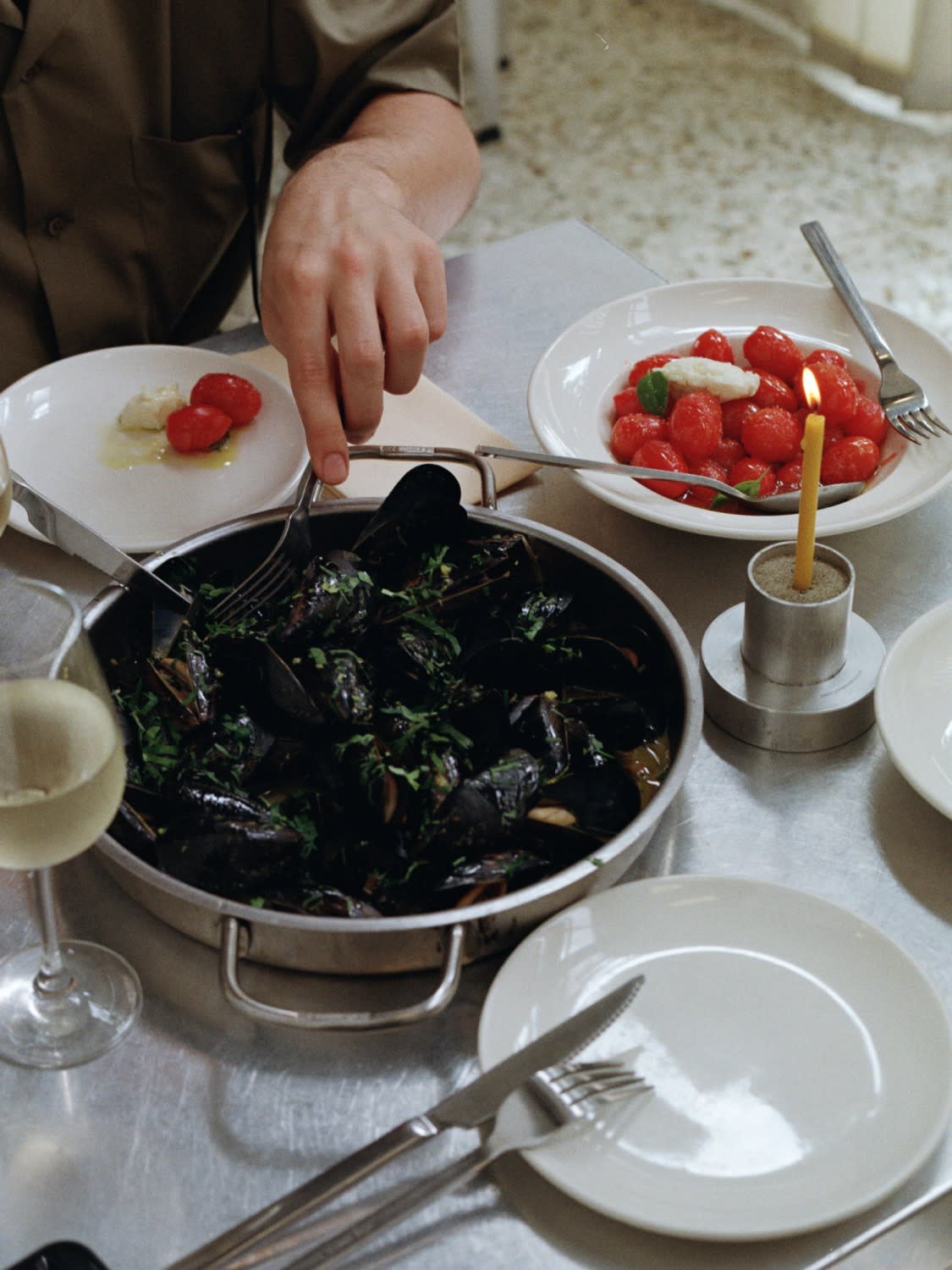 The open kitchen provides a buzzy atmosphere, coloured by the abstract paintings of Greek artist Tefra90 and sunlight washing in through glass walls on both ends. Cool evenings call for dinner under a lemon tree at the patio. Purchase a candle at the end to commemorate your meal.