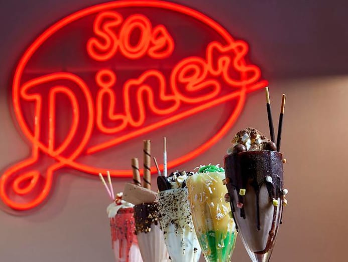 Neon signs, vintage posters, formica-topped tables, vinyl-upholstered seating, mosaic-tiled floors, and oversized glass jars filled with colourful candies (which you can buy by weight) evoke cheery nostalgia, while the menu of hotdogs, burgers, sandwiches, milkshakes and sundaes reflects a refined, contemporary approach to typical diner fare.