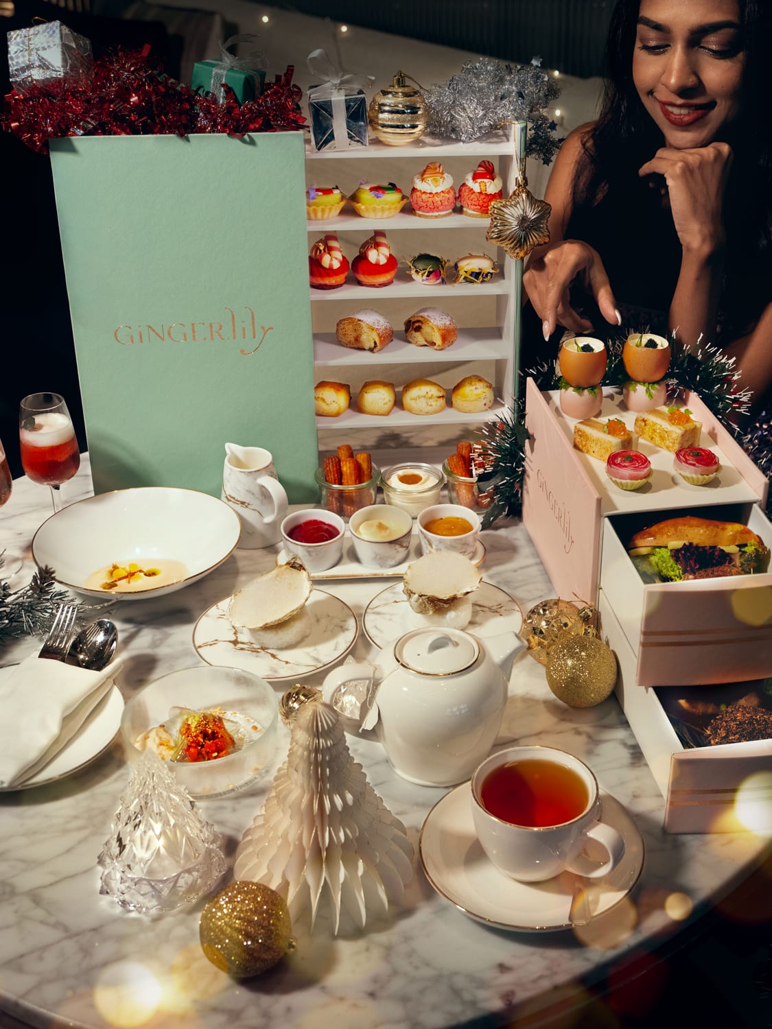 Ginger.Lily’s Festive Afternoon Tea (S$78) begins with tipples like a mulled wine sour cocktail or cranberry rose mocktail at the bar, before sweet and savoury bites such as crispy veal stew brioche, foie gras mousse croque, and gingerbread-spiced scones.