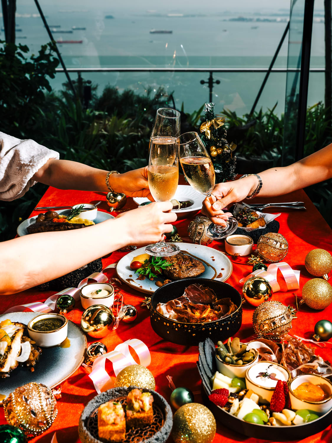 The festivities hit different when they come with a view. At the vibrant rooftop bar, 1-Altitude Coast at Sentosa, ask for the Festive Coast Platter (S$78), which comes with a generous spread of 1824 MB3 sirloin, honey baked ham, roasted turkey breast, seared barramundi, and spinach and mozzarella arancini. From Dec 8 to Dec 26, 1-Alfaro — set on the 34th storey of Labrador Tower — is serving a Communal Menu (S$88, minimum two diners) that begins with an indulgent bread service and a procession of appetisers including stracciatella cheese with Parma ham, cold cuts and cheeses, and offerings like fried lasagna and tuna and Hokkaido scallop tartare.