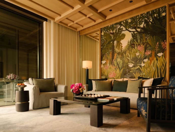 The opulent, 650 sq m four-bedroom Royal Villa boasts an expansive living room, a lavish master bedroom and bathroom, along with three additional bedrooms, making it ideal for larger groups or families. A tapestry in the living room with expressive floral patterns establishes a connection to the tropical surroundings.