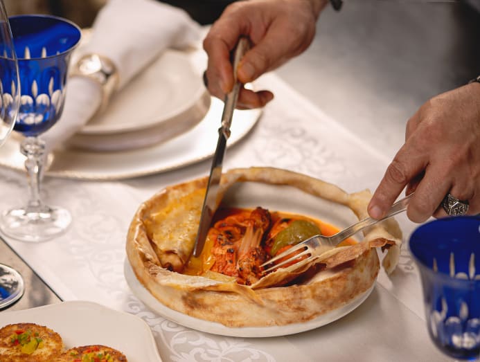 Everyone roared in delight when the giant Naan Bukhara appeared: A comically upsized flatbread nearly a metre in length, sailing in on its own serving apparatus that made it look like a flying carpet coming to rest in the centre of the table. The idea is for everyone to “break bread” together. Made from just over 1kg of dough, the Naan Bukhara is baked in its own dedicated tandoor, being the big, scene-stealing star of the show it is.