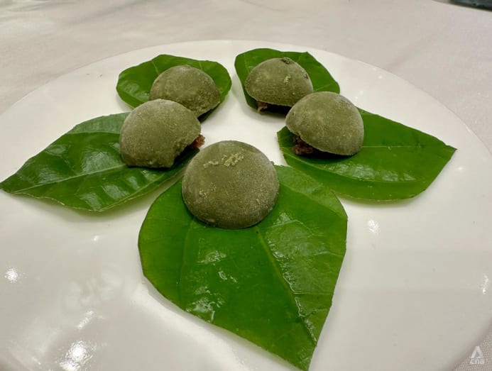 I also wasn’t expecting, for instance, the server to come by with a lighter and ignite the tiniest of flames on my raw mango pudding, a dish of unripe mango pulp cooked with ghee, sugar and corn flour, served with chilli, mustard and cashew nuts. Turns out, there was a fingernail-sized edible candle sitting on the plate, the wax made of melted and set ghee, and the wick made out of dried lotus thread. The yellow micro-candle burned with all its little might before melting in seconds into the dish, a culinary wink and glimmer of playfulness.
