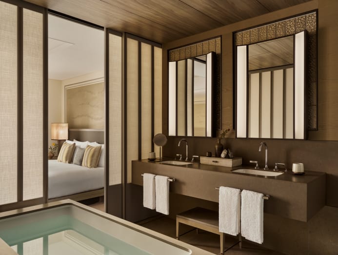 Aman wrote the playbook to the quiet luxury aesthetic, and that reigns at Janu with a tasteful colour palette of greys and creams, an open layout cleverly demarcated by screens and a general streamlined design. Intentionally woven in are Japanese elements such as a “sakan” (traditional plasterwork) artwork hanging above the bed, partitions referencing shoji screens, and washi paper details throughout.