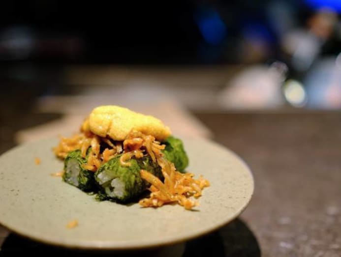 He said that three dishes are indicative of their approach, starting with Chungmu Gimbap, a dish with rice mixed with sesame oil that is wrapped in sweet laver, eaten with semi-dried anchovies and fresh uni mixed with gochujang paste.