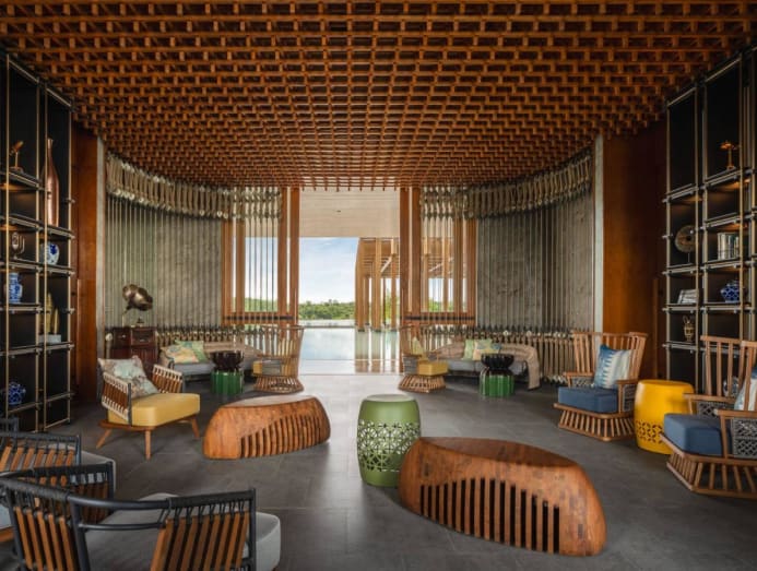 The foyer sits on raised land, offering fine vantage of resort grounds. “The plot offered a striking contrast: The coastline opened up to a lush jungle landscape, providing an opportunity to craft an immersive journey from water to land,” said Pellaros, on being inspired by Bintan’s natural environment.