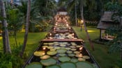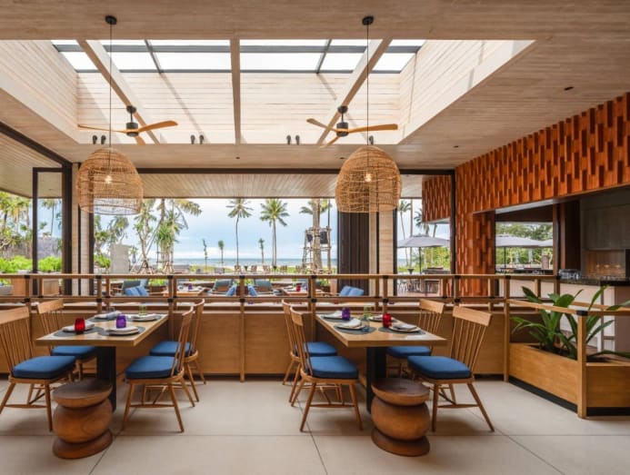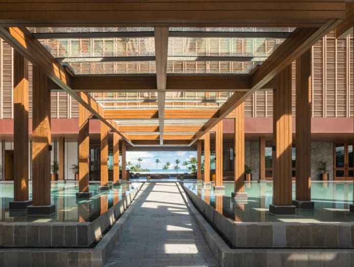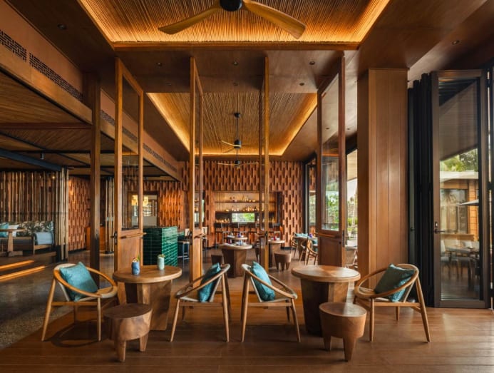 Rather than a single building, the programmes are distributed among several blocks, strung together by landscaping and water bodies. “Shade under coconut trees and timber boardwalks winding through lush tropical greenery create pathways that not only connect different zones of the resort but also frame the surrounding views,” Palleros described.