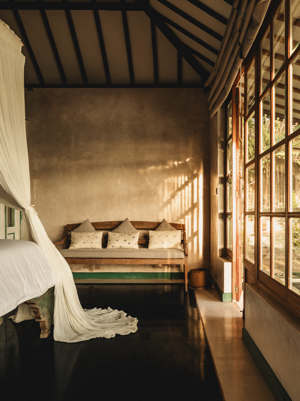 Two of these joglos have been reimagined as guest villas, with subtle contemporary interventions such as soft Italian limewash walls, mid-century modern furnishings, and discreetly integrated air-conditioning and plumbing.