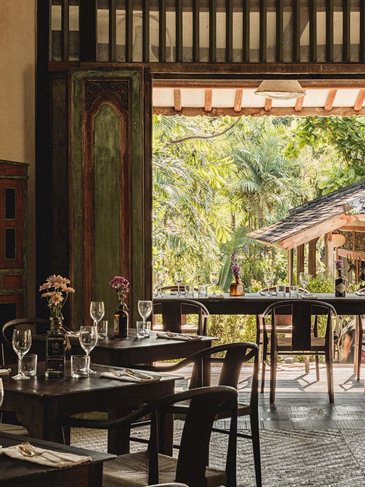 Working with an antiques specialist, the team carefully dismantled the joglos in Java and transported them to Bali, where they were reconstructed piece by piece at Magia de Uma. Rather than restoring them to a pristine state, the team chose to retain their irregularities – gaps in the wood that catch the light at certain angles and paint-worn panels that speak to their age – allowing their natural patina to come through.