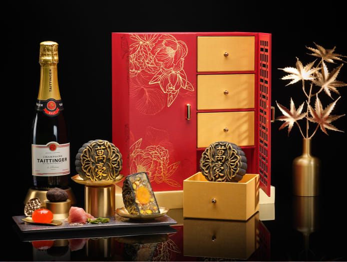 For good, old-fashioned auspicious symbolism, check out the Wan Hao Chinese Restaurant’s red gift boxes with gold-stamped peonies. For extra splashy gifting, opt for the Premium Gift Set (S$248), which includes a 325ml bottle of Taittinger Brut Reserve Champagne and a quartet of Wan Hao’s best-selling Golden Black Truffle with Dry-Aged Parma Ham, Pistachio, and Single Yolk baked mooncakes.