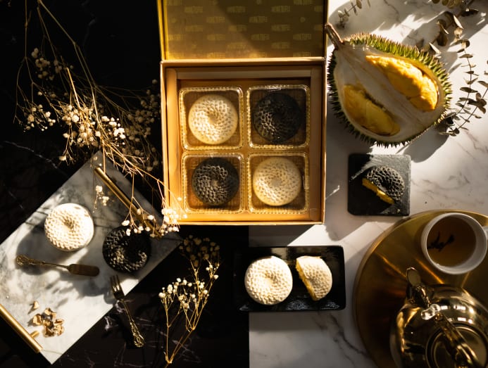 Encased in a snowskin made from Japanese mochi flour is a rich filling of Pahang mao shan wang durian flesh flecked with black winter truffles that imbue the fruit with earthy depth. The onyx-skin version is showered with gold dust in case you need an extra dose of edible ostentation. Prices start from S$108 for a box of four mooncakes.