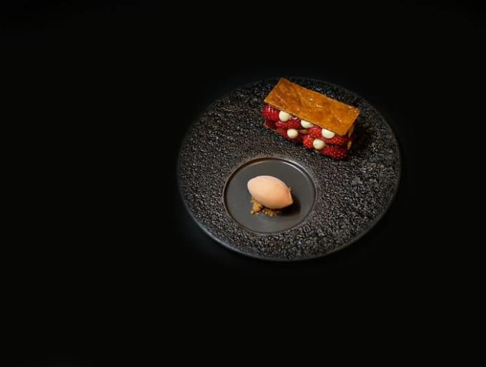 That combination of sweet, savoury and tart is also present in the dessert, Mille Feuille, a sublime confection composed of strawberries, acerola cherry sorbet and Okinawan salted vanilla cream. The latter is an inspiration from a salted vanilla ice cream that Kiga tasted on his trip.