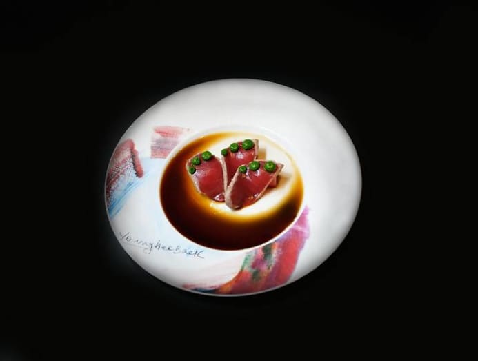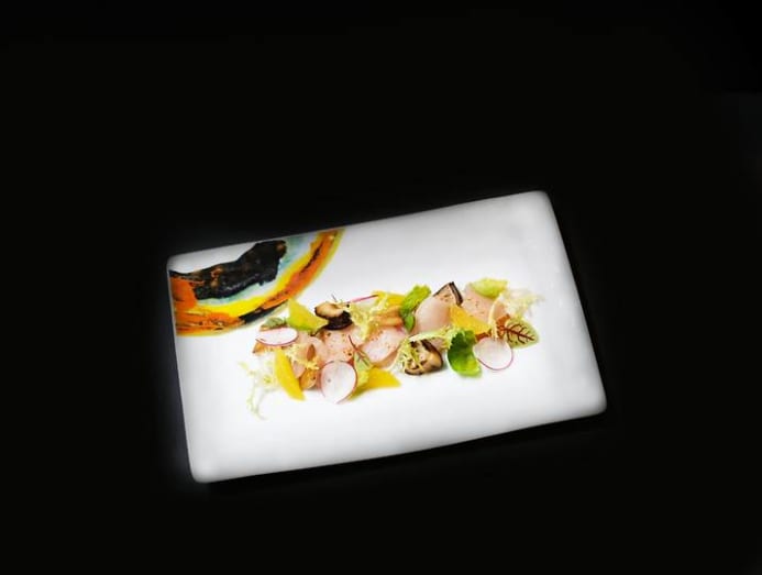The first course, Katsuo – seared bonito marinated in Tosa soy sauce – exemplifies this. The flesh is delightfully springy, as if the fish had just been hauled in a few hours ago. A bed of compressed watermelon and tiny dollops of a kaffir lime-herb puree amplifies the freshness.