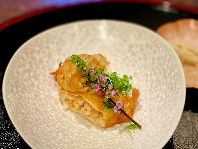 Once a luxury for samurai and nobility, she explained, the yuba here is served wrapped around minced prawns seasoned with kewpie (Japanese mayo, perhaps the most homestyle element of the meal) and fried so that it ate like an incredibly tasty and delicate ngoh hiang. Served alongside this ambrosial nugget was a sliver of the uncooked yuba accompanied by the barest dab of wasabi to accentuate its ethereal flavour.