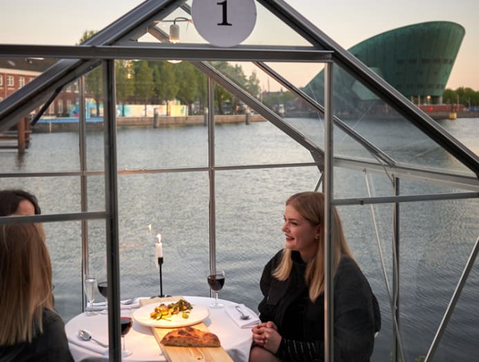In Amsterdam, art centre Mediamatic offers a greenhouse dining experience along the Oosterdok waterfront with its Serres Separees restaurant. Each greenhouse fits two to four people and dishes from the seasonal plant-based menu are served on long boards by waiters wearing face shields and latex gloves.