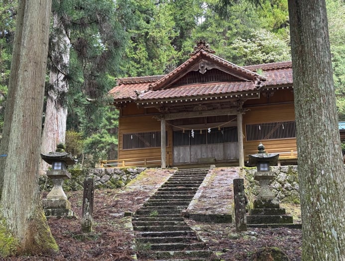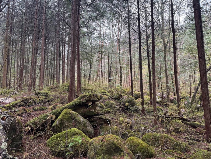 After this promising start, we set off. Our first modest walk along the storied trail wound through Ochiai and its small villages nestled against terraced fields. Ancient cobblestones, worn smooth by centuries of footfall, guided us through forests past old kosatsuba, or wooden notice boards once used by the Tokugawa shogunate to post laws and edicts. Every so often, we'd come across a metal bell hanging from a post, which Shin-san encouraged us to clang. “For bears,” he explained, though I suspected they were still in deep slumber.