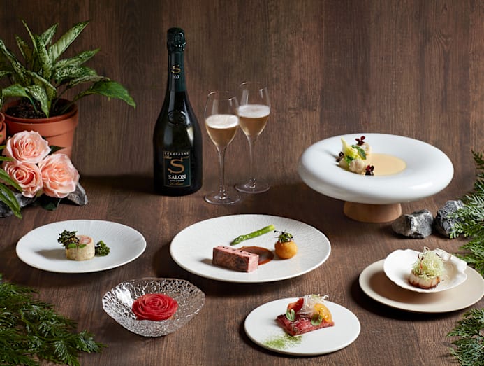 Come at 7pm for a more luxurious four-course menu (S$250 per person) that includes two rounds of starters – think Hamachi & Hokkaido Scallop “Ceviche” and a decadent Smoked Bone Marrow Flan – and an amuse-bouche of lightly steamed langoustine “sashimi”, adorned with Kaluga caviar.