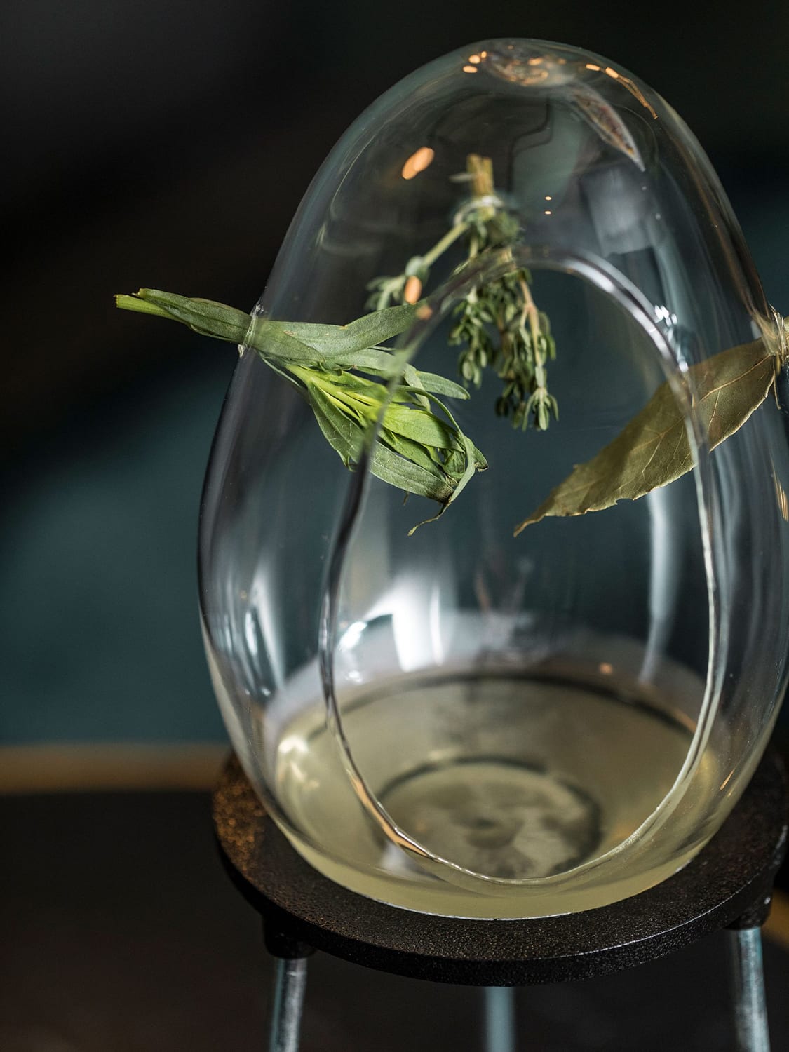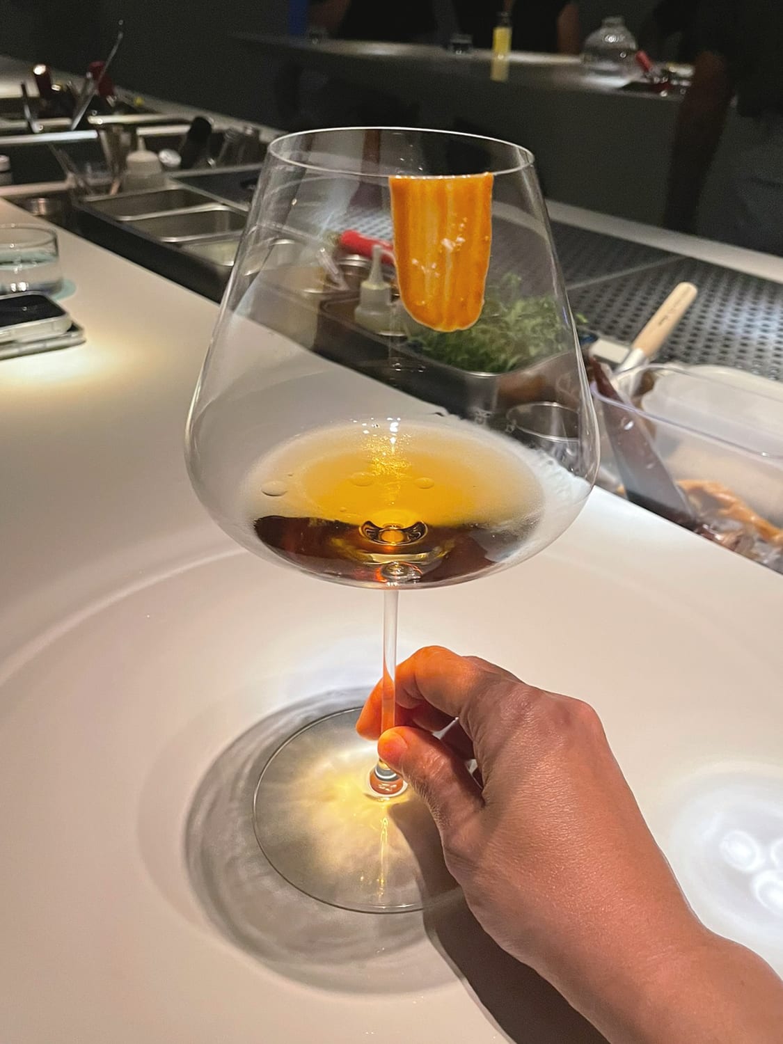 The Krypta cocktail, made with gin, Hibiki Harmony whisky, and clarified kiwi demonstrates this best. The honey-hued liquid is served in an oval-shaped vessel adorned with a variety of fresh herbs and sitting on a stand. The vessel has an opening, inviting drinkers to breathe in its herbaceous scent while savouring the flavors, merging aroma and taste in a unique way. The glass not only serves a functional purpose but also makes a striking statement, aligning with Sips' commitment to innovative and artistic mixology.