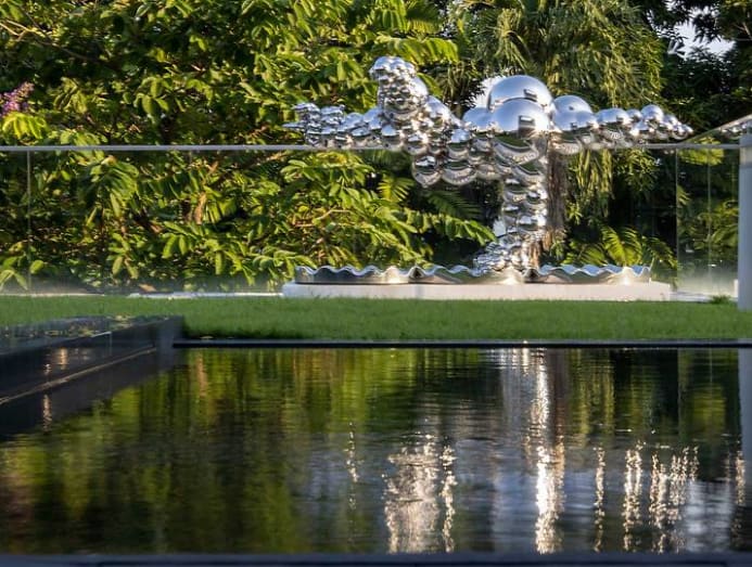 In the garden is local artist Yeo Chee Kiong’s Pet sculpture from his Ideal Lady Series. The cluster of stainless steel bubbles appears to levitate, and can be seen from the street through glass balustrades. The metallic shine and rotund forms contrast with the lush landscape and boxy architecture.