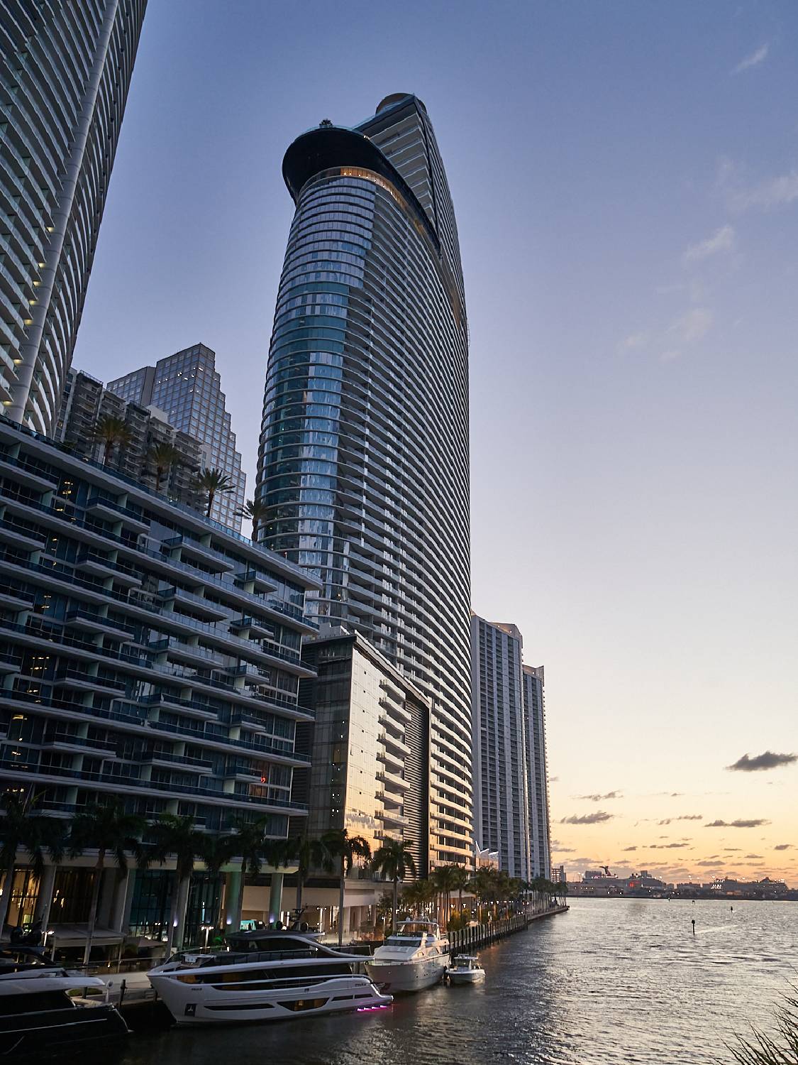 The new Aston Martin Residences Miami is situated on the highly coveted Miami waterfront in Biscayne Bay; its 66-storey curvilinear structure redefining the Miami skyline and evoking the sleek, aerodynamic forms reminiscent of Aston Martin sports cars.