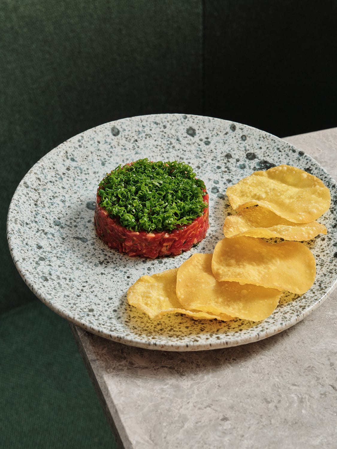 Guests can savour reimagined classic dishes from Switzerland with a Singaporean twist. Some standout dishes include the Golden Roesti (S$25++), a fresh take on the traditional rosti transformed into bite-sized portions and topped with caviar and gold flakes. The Spiced Beef Tartare with sriracha (S$25++), served with wonton skins, is a unique twist on the dish.