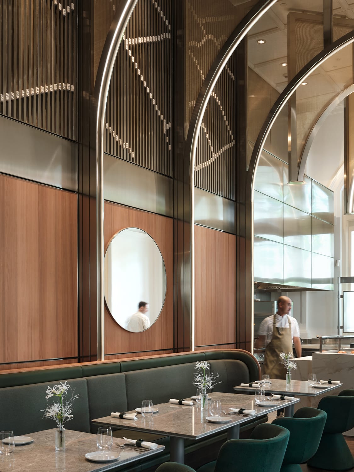 Muted greens and gold-gilded edges are used throughout the space, along with local woods as a nod to Singapore’s identity as a garden city. A large LED screen on the ceiling of a walkway teleports visitors to the Valle de Joux, showcasing the Jura region transiting through the four seasons of the year.