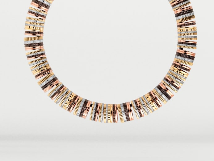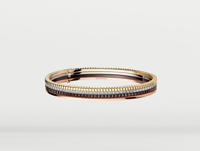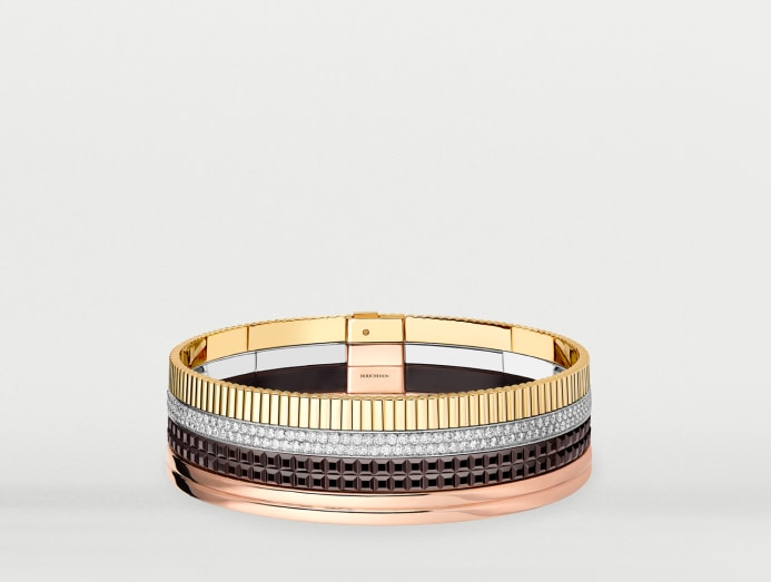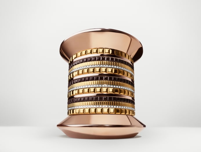 In another tribute to the Quatre's four emblematic motifs, Boucheron's new designs layer and stack rings as well as bracelets in unexpected ways. Notably, a collar necklace crafted from no less than 50 Quatre rings demonstrates the maison's signature craftsmanship. The collection also introduces a novel bracelet concept. Resembling a spool that can hold 12 interchangeable elements, this piece highlights Boucheron's dedication to versatile elegance. Each design comes in two versions, the Quatre Classique and Quatre Radiant Edition, which allows wearers total freedom in how they style it.