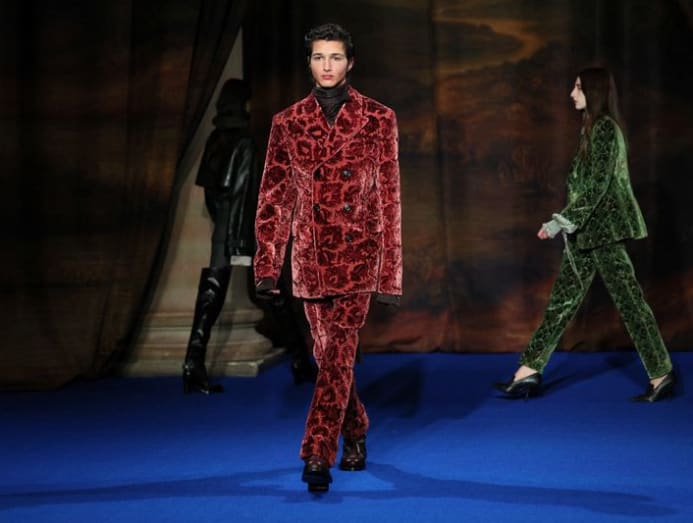 Jacquard-woven trenches and brocade jackets were inspired by the tapestries and wallpaper of stately homes, with silk pyjama shirts and trousers evoking domesticity.