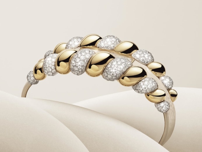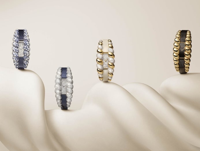 The collection now gets a timepiece in the form of the Tressage jewellery watch that sits like a sculpture on the wrist. The bold design plays on volume and texture with an elongated rectangular case framed by two asymmetrical braided twists. There are four versions – yellow gold with a black lacquer dial and black strap; a full pave white gold version with 916 diamonds (12.2 ct) and a navy strap; a mixed gold version with 466 diamonds (6.3 ct); and a white gold model with 570 diamonds (5.7 ct) and 330 sapphires (5.9 ct). Each version is powered by a quartz movement.