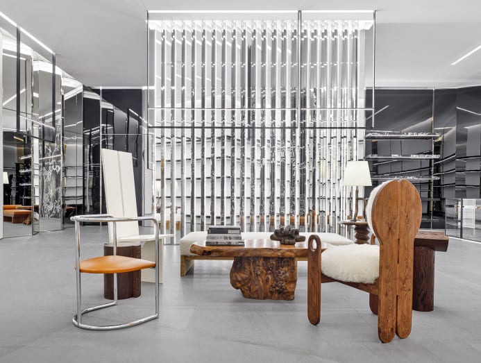 The new Celine boutique features natural stones like basaltina and marble juxtaposed with warmer elements that include oak and brass fixtures, as well as antique gold mirrors. (Photo: Celine)