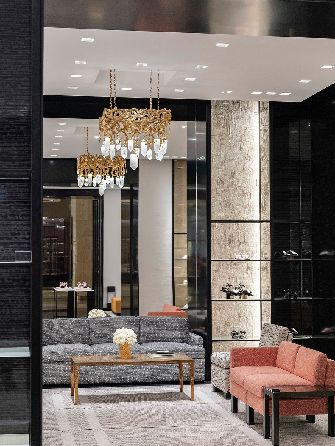 From the outside, expansive windows and softly lit alcoves draw the gaze to the latest collections. Step inside and you’re greeted by a golden-brass and rock-crystal chandelier by Goossens, above a painting of camellias by Peter Dayton, a poetic nod to Gabrielle Chanel’s favourite flower.