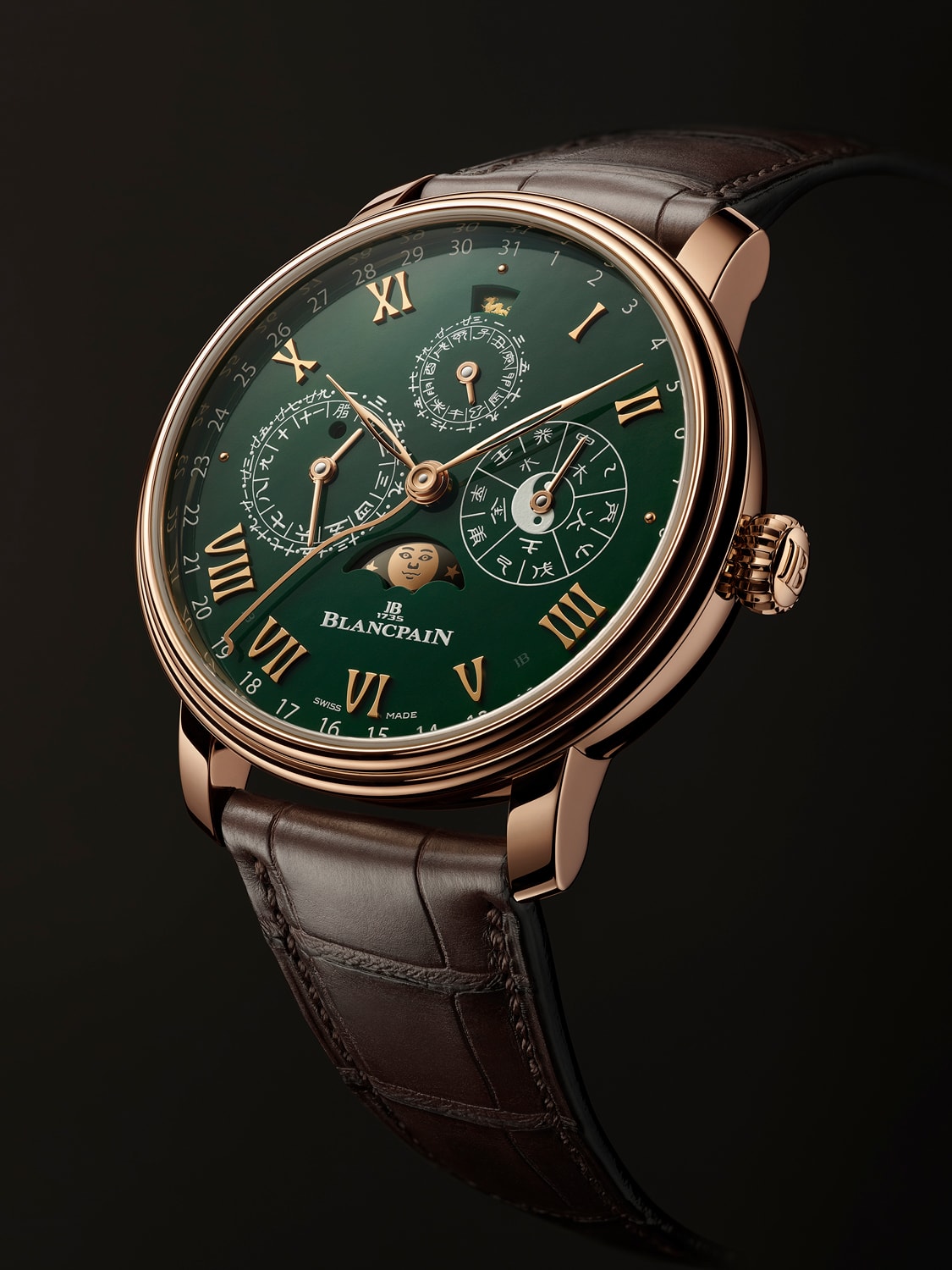 Launched in 2012, the Villeret Traditional Chinese Calendar was the world’s first wristwatch combining a complex Chinese calendar, Gregorian date and moon phase. Since then, Blancpain has offered an annual limited edition that recalls the legend of the Jade Emperor summoning the 12 zodiac animals to his palace. For 2024, the maison marks the timepiece’s second 12-year cycle with a 45mm red gold model featuring a green Grand Feu enamel dial – a first for the 50-piece special edition. On the reverse, this grand complication flaunts an engraved dragon, ruby and the Chinese inscription of Wood Dragon on the red gold winding rotor that’s visible through a transparent caseback. The Chinese calendar is displayed through four dedicated hands, as well as a window each for the zodiac and leap month. The Gregorian date is indicated via a traditional serpentine hand, while the moon phase is presented in a window at 6 o’clock.