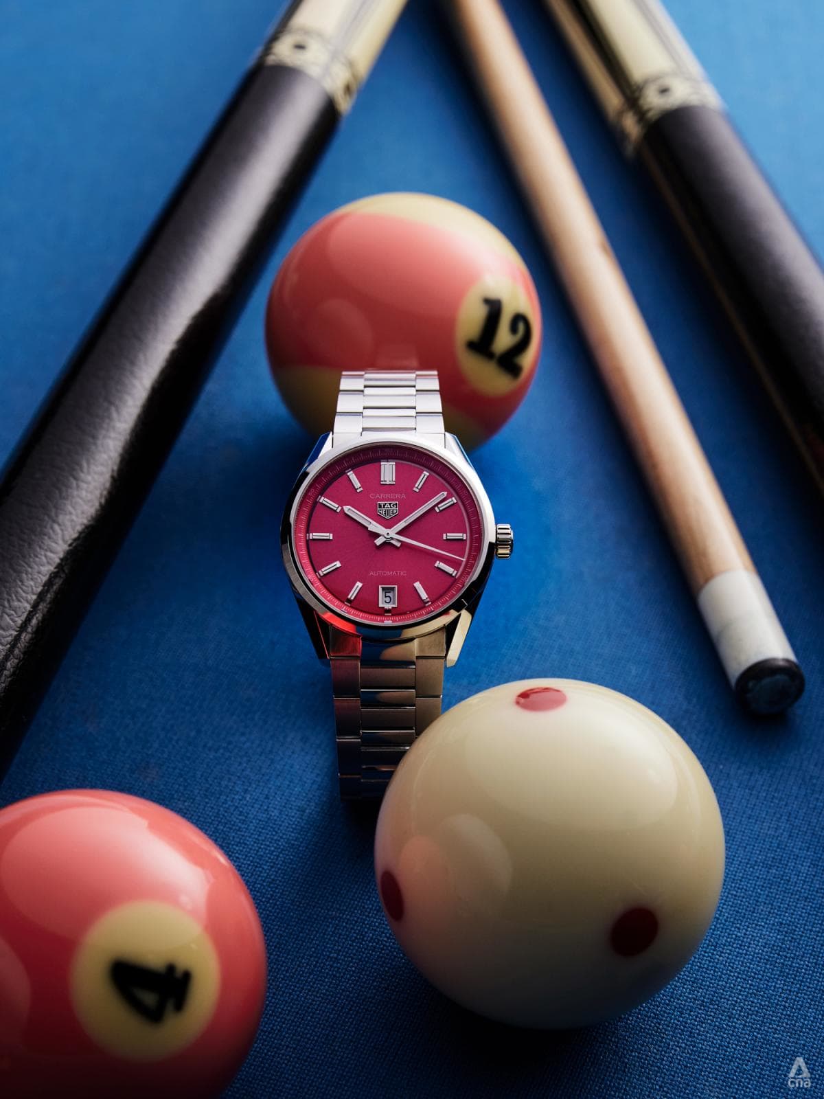 Returning to the original size of the OG Heuer Carrera, the Carrera Date 36mm comes with a clean, sun-brushed dial in warm silver, signature blue, pastel green and hot pink. These coloured dials alone would have completely transformed the watch’s looks, but TAG Heuer took it two steps further. The watch’s profile has been tweaked for a more ergonomic wearing experience: The case is 2mm thinner than existing models, there’s a new tapered bracelet design, and the crown now sits squarer to the case edge. It has also been equipped with the Calibre 7 Automatic movement, which offers a 56-hour power reserve instead of the 38 hours of its previous Caliber 5 movement.