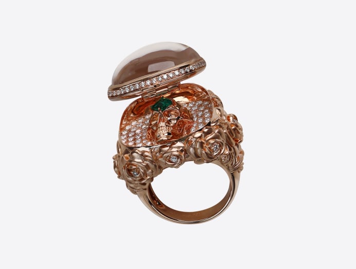 Every piece is also a “one-in-the-world” design. In addition, several pieces in the collection are transformable, and some even have hidden elements of surprise. The Beauty of Life cocktail ring, for example, can be opened to reveal an 18k rose gold skull, set with a Colombian emerald and surrounded by a halo of diamonds.