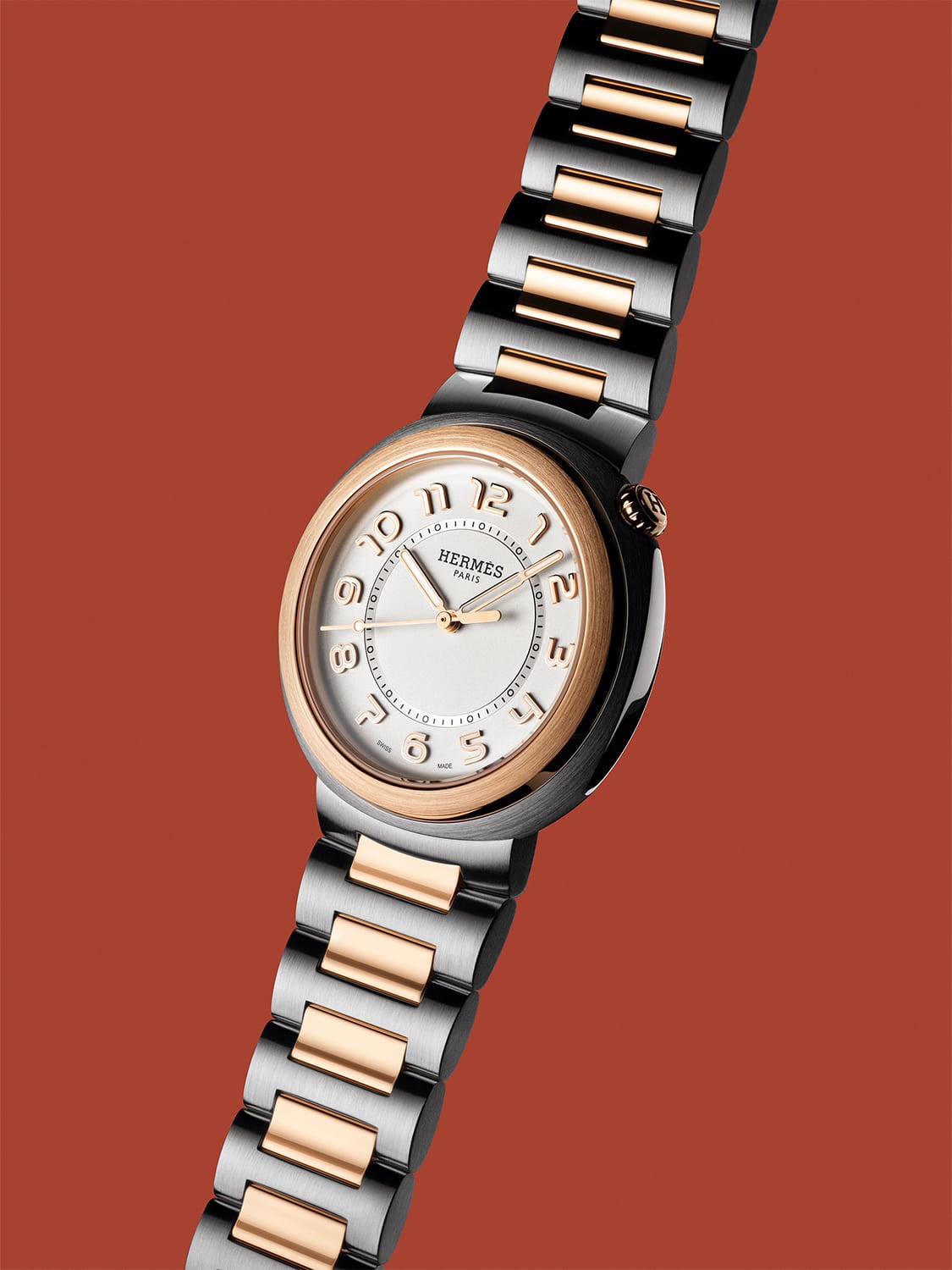 As a fresh twist, the crown is unexpectedly positioned at the 1.30 mark, embellished with a lacquered or engraved H. The seconds hand on the steel model features a luminescent Hermes orange dot, with grey and orange-accented minutes track. The two-tone models on the other hand do without orange accents for a pared back aesthetic.